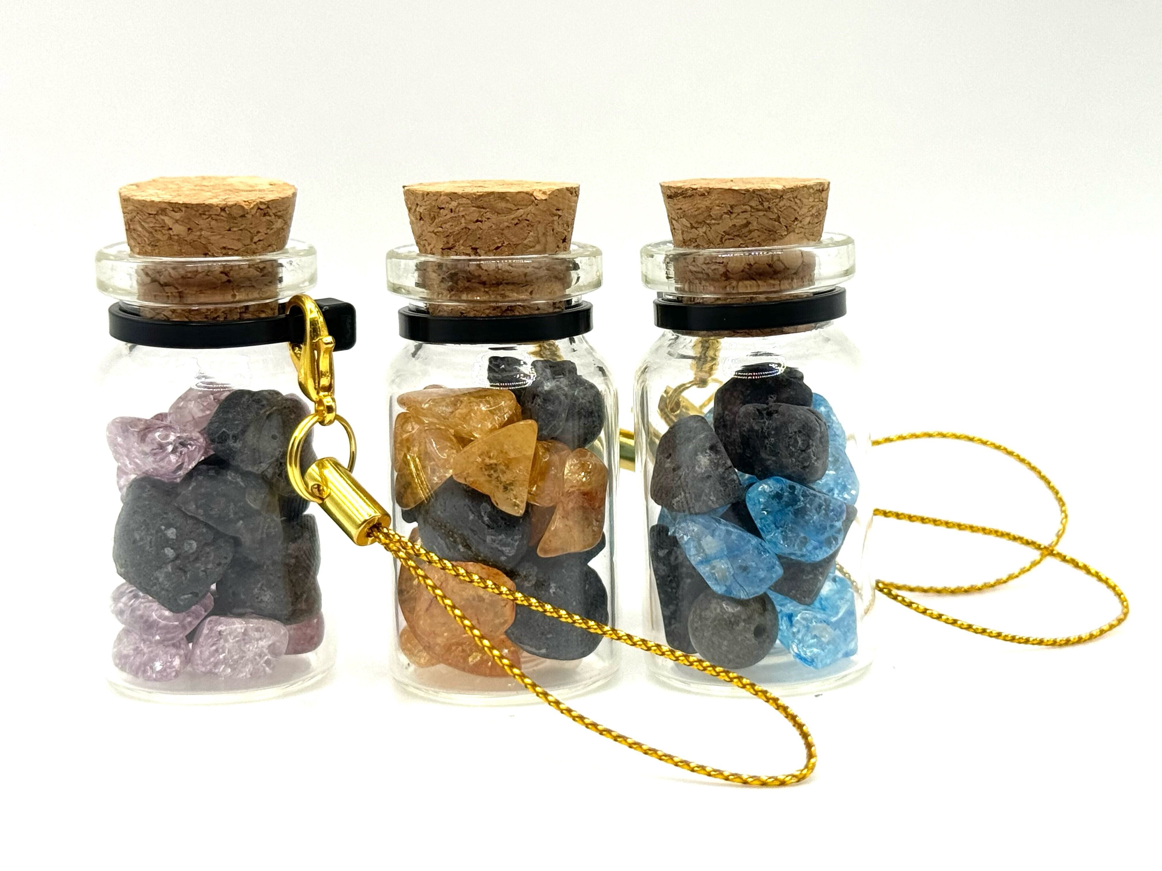 クラック水晶は、天然水晶に人工的なヒビを入れたもので、光が当たると美しく輝くので、ガラスの小瓶をきれいに彩ってくれています。また、浄化力が強く、開運、厄除けの効果があると言われているそうです。7色からお好きな色をお選びください。