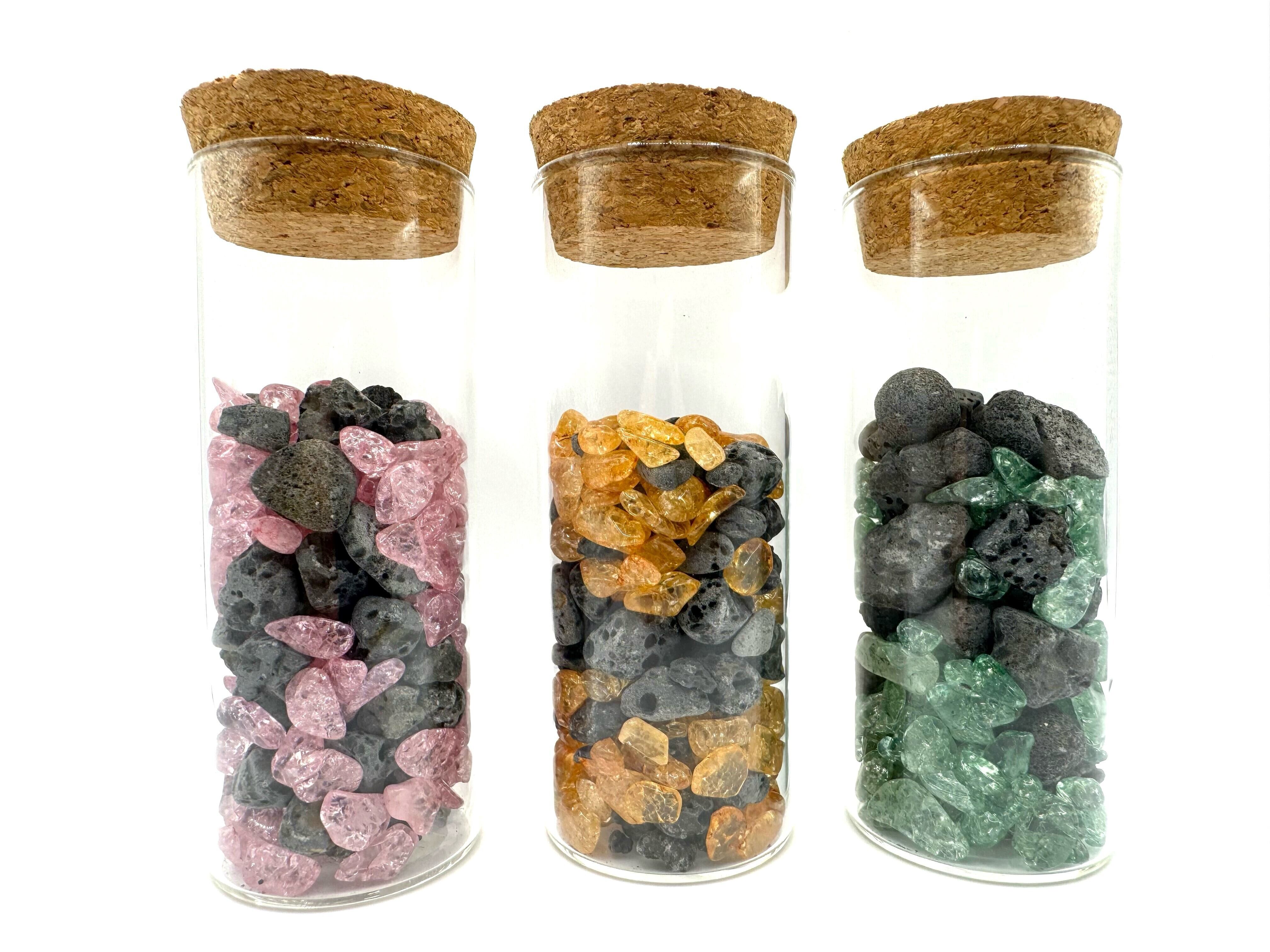 クラック水晶は、天然水晶に人工的なヒビを入れたもので、光が当たると美しく輝くので、ガラスの小瓶をきれいに彩ってくれています。また、浄化力が強く、開運、厄除けの効果があると言われているそうです。7色からお好きな色をお選びください。